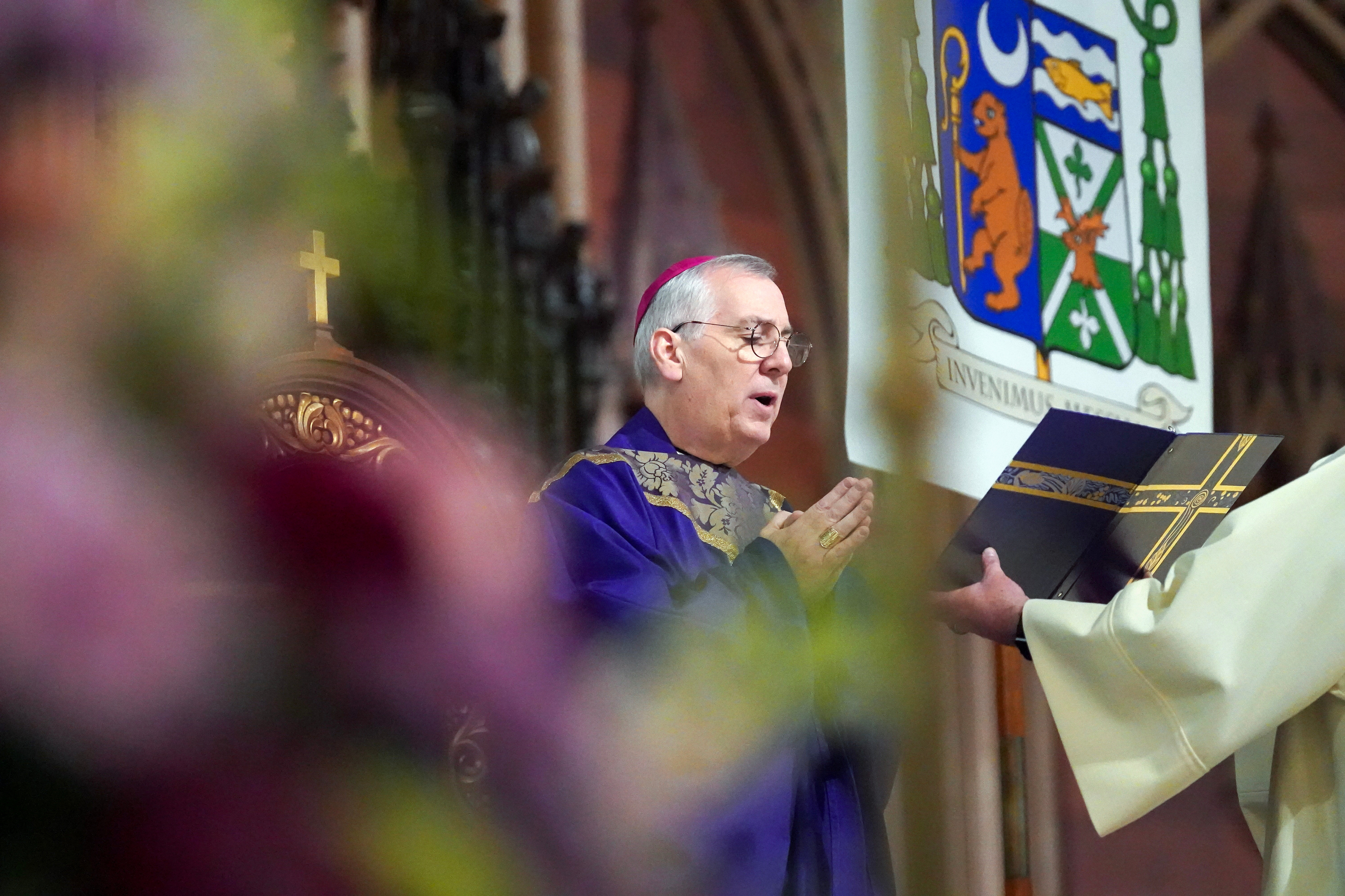 Bishop Mark O’Connell leads in prayer during his first mass as Bishop of the Roman Catholic Diocese of Albany on Sunday, Dec. 7, 2025, at the Cathedral of Immaculate Conception in Albany, N.Y. Cindy Schultz for The Evangelist In his Sunday homily, Bishop O’Connell echoed a similar message from his homily at the installation: that we are all called by God to proclaim the Gospel, but Sunday he explained it with some added help from John the Baptist.