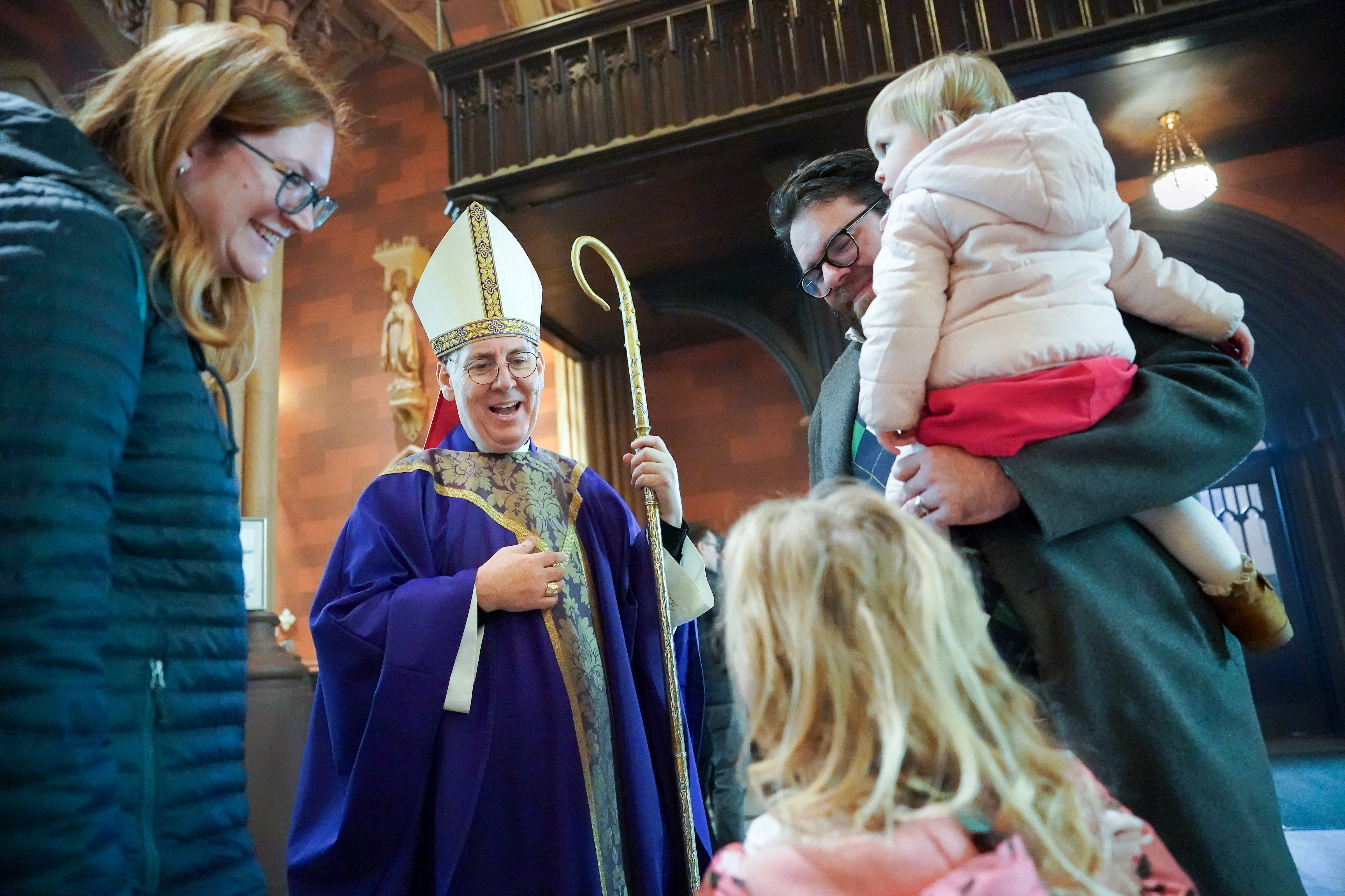 Bishop Mark O’Connell, center, laughs with choir member Frances Williams, left, and her daughters Rose Williams, 4, Eliza Williams, 21 months, and husband Brett Williams after Bishop Mark’s first mass as Bishop of the Roman Catholic Diocese of Albany on Sunday, Dec. 7, 2025, at the Cathedral of Immaculate Conception in Albany, N.Y. Cindy Schultz for The Evangelist.Bishop O’Connell joked that when he tells his vocation story to children about his calling to the priesthood, he’ll exaggerate the tale. In the grand version, Bishop Mark, on his 18th birthday, was out riding his horse when he was stopped by rain, thunder and an angel descending from the clouds, a mighty scroll in hand, to announce to him, “Mark, you’re a priest!”The truth was that Bishop Mark was preparing to start school at Boston College and needed to pick a major. He went to the back porch of his house to contemplate what to do, and while standing outside, he recalled having three thoughts.