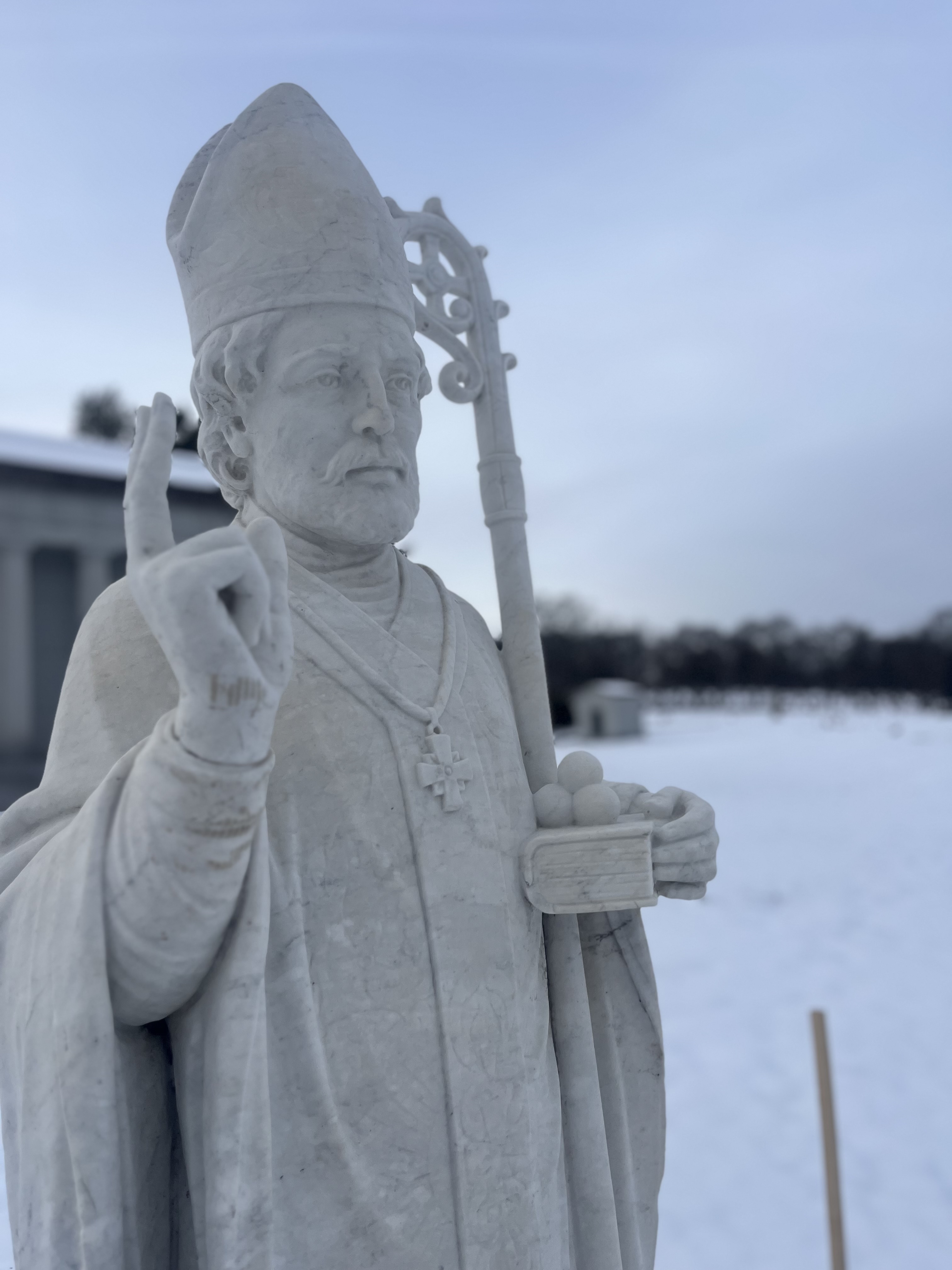 St. Nicholas was one of three life-sized statues recently donated to Albany Diocesan Cemeteries. Each statue — one of St. Anne, St. Nicholas and one depicting the Holy Family — is dated from the 1940s, was carved in Italy from Italian marble, and shipped to the U.S.