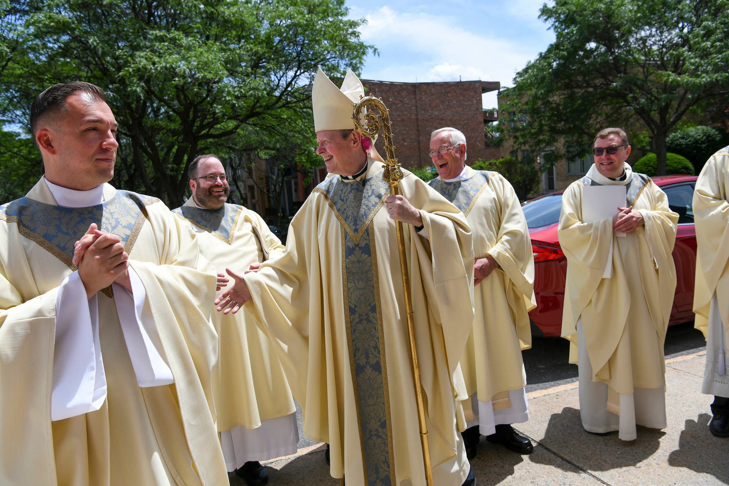 ... Bishop Scharfenberger greets priests following the Ordination to the Priesthood of five priests at the Cathedra on June 19, 2021. ...
