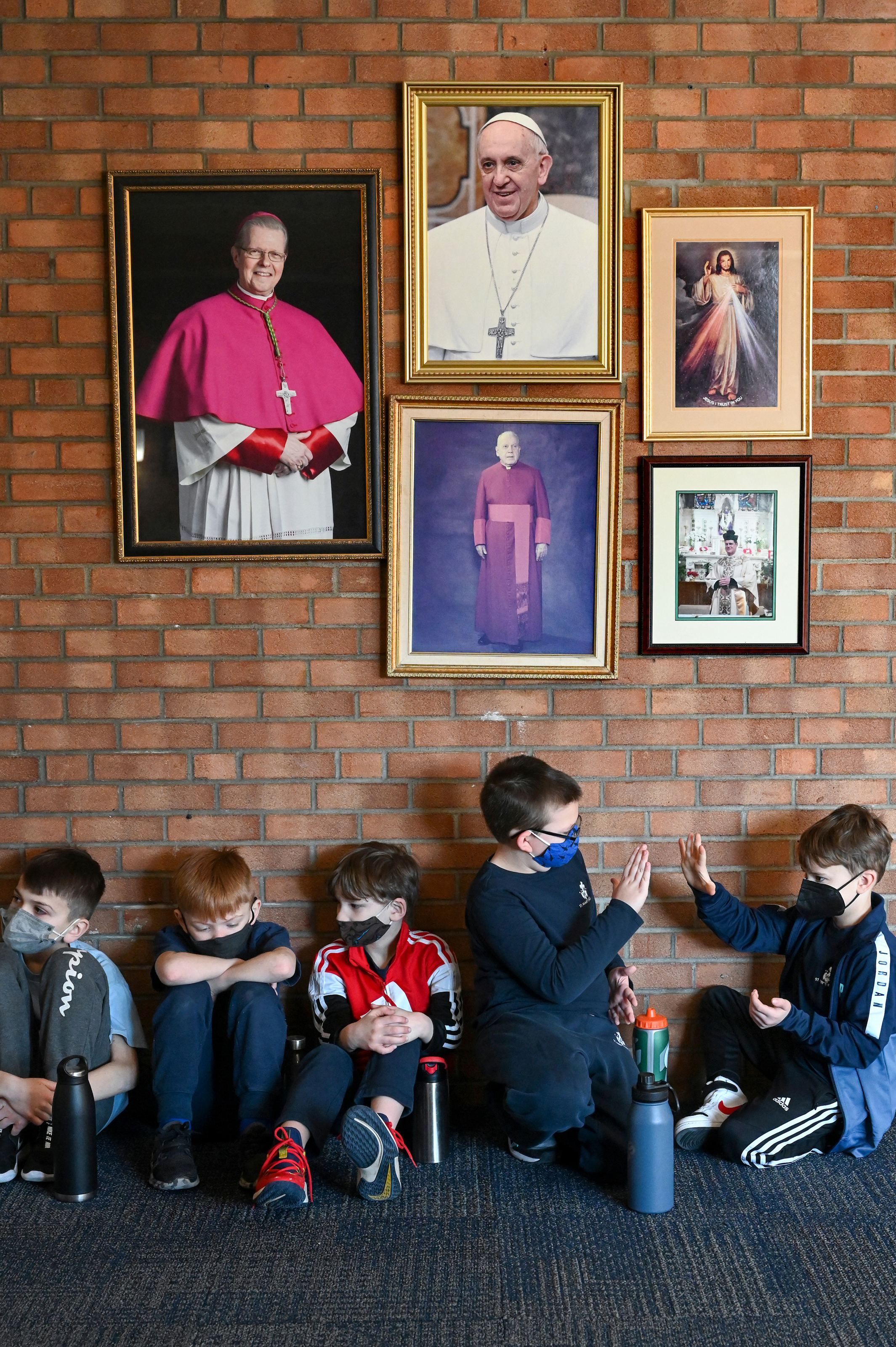 ... A portrait of Bishop Scharfenberger hangs in an honorary position next to Pope Francis in a school hallway at St. Mary’s Institute in Amsterdam in 2022. (Cindy Schultz photos for The Evangelist)