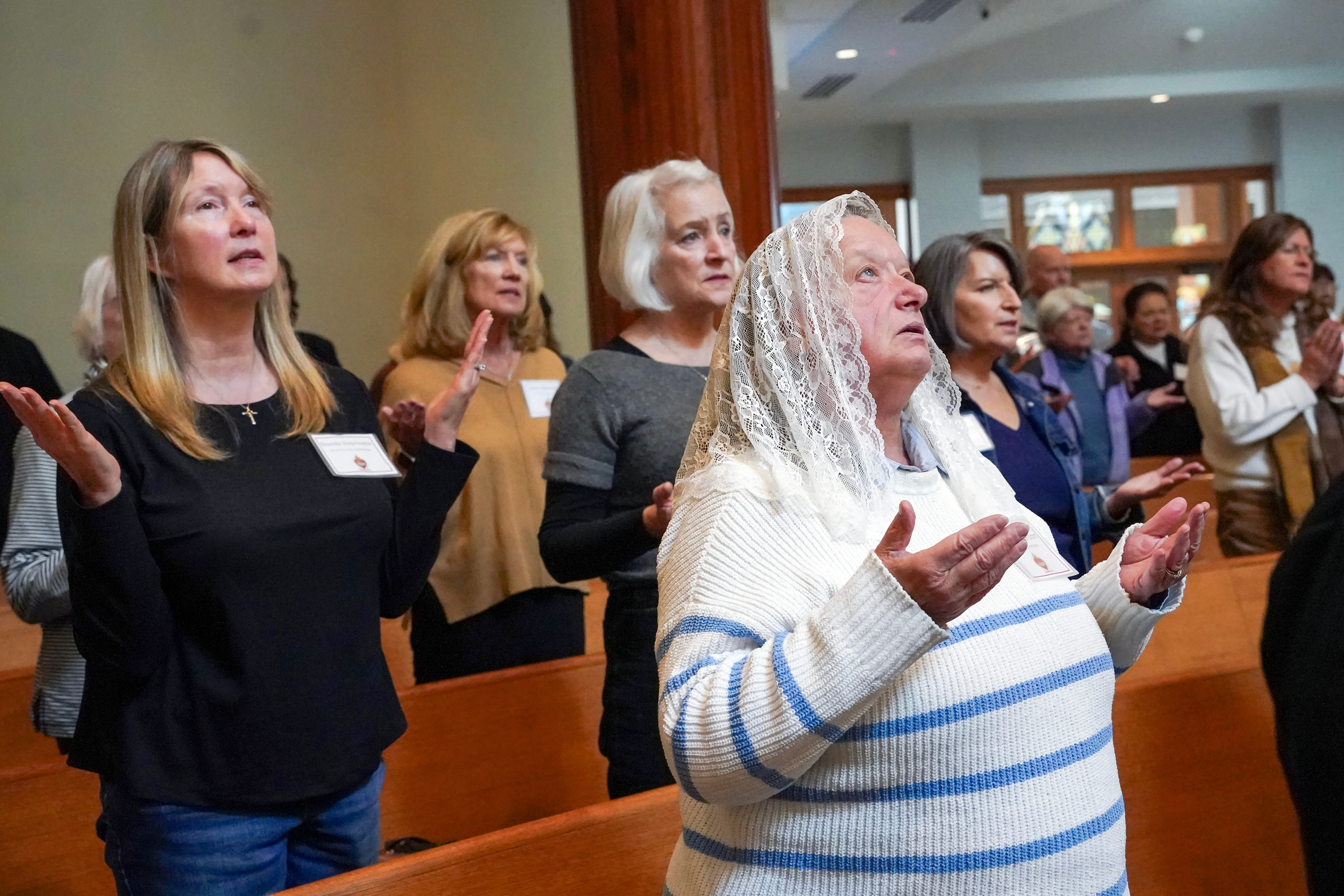 Robin Anderson with St. Mary’s in Granville, right, joins in the Lord’s Prayer during the Unleashing Love Women’s Retreat on Saturday, Oct. 18, 2025, at St. Edward the Confessor in Clifton Park, N.Y. Cindy Schultz for The Evangelist Bielawa attended the first women’s conference in 2022, recalling it as “an eye opener for me. It exposed me to a depth or an opportunity to dive into my faith in a deeper way with other women.”