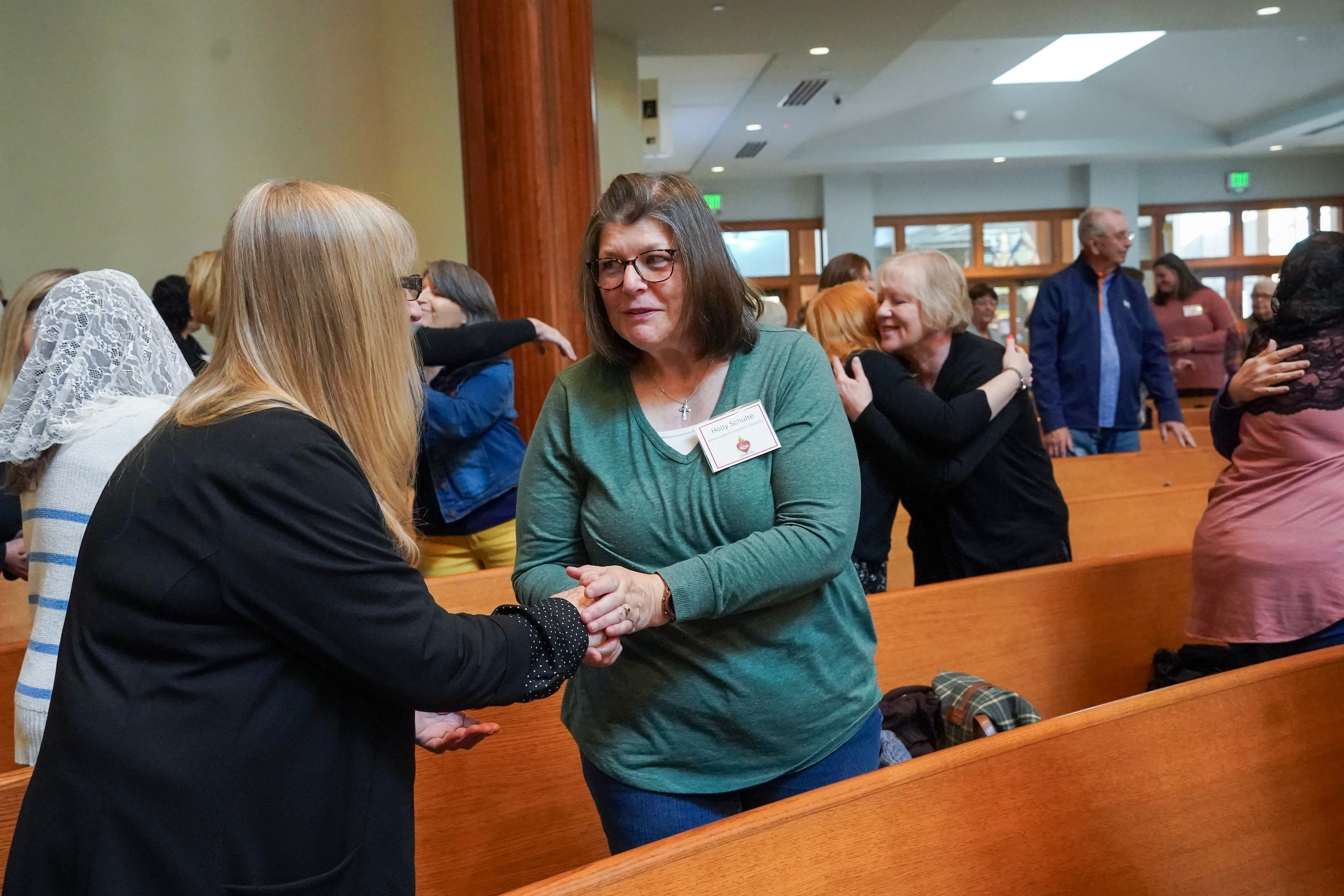Holly Schulte, right, shares a sign of peace during the Unleashing Love Women’s Retreat on Saturday, Oct. 18, 2025, at St. Edward the Confessor in Clifton Park, N.Y. Cindy Schultz for The Evangelist The rosary, journaling, art, knitting, prayer shawls or walking are all options for a woman’s “prayer tool box,” so long as she “consciously makes an intention” before her activity to really listen to God, or ask him to show her what she needs to see.
