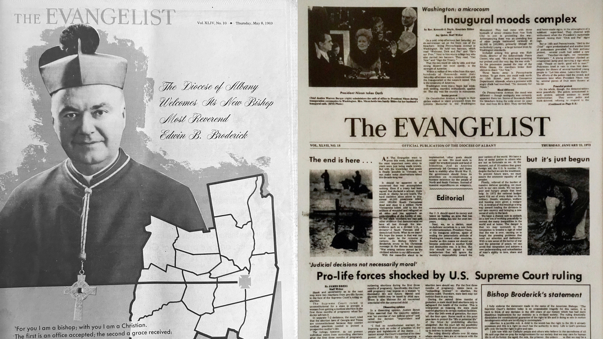 This was a decade of change and turmoil: now-auxiliary Bishop Maginn attended the Second Vatican Council (1962-65), and on Nov. 22, 1963, President John F. Kennedy, the first Catholic president, was assassinated in Dallas. The headline in the paper read “World Mourns President.” Rev. Martin Luther King Jr. was slain by an assassin’s bullet on April 4, 1968, and later that year on Nov. 5, Robert F. Kennedy was also murdered. And all the while the war in Vietnam raged on. In 1969, Bishop Edwin B. Broderick became the eighth Bishop of Albany. It was also during this time that The Evangelist circulation tripled due to a mandate from Bishop Broderick.