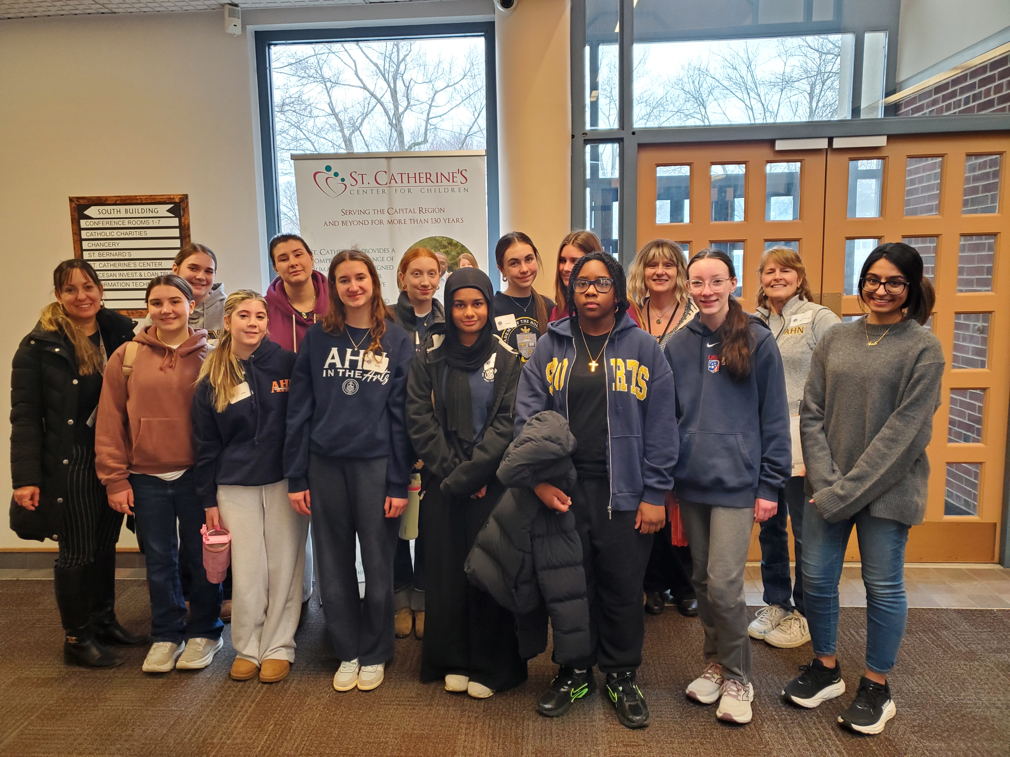 Holy Names students at St. Catherine’s Center for Children.Night Out For You, creating raffle baskets for upcoming fundraisers; Patroon Land Farm (Ketcham Road, Voorheesville), labeling flower beds and planning items in heated greenhouse; Promenade at University Place (1228 Western Ave., Albany), doing a craft project and interacting with senior residents; Ronald McDonald House (139 S. Lake Ave., Albany), sorting donated “pull-tabs” from soda cans; South End Children’s Café (33 Rensselaer St., Albany), cleaning out and organizing storage area; Sister Maureen Joyce Soup Kitchen (369 Livingston Ave., Albany), preparing meals and assisting participants; St. Catherine’s Center for Children (40 N. Main Ave., Albany), organizing donations the center has received for children in their care; and the St. Louise House (96 Menands Road, Albany), making blankets for Troy schools in need.